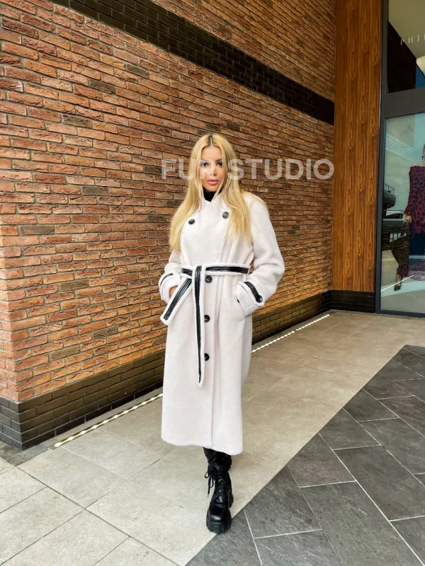 Белая шуба из натуральной шерсти отличная альтернатива меховым изделиям для тех, у кого ограничен бюджет. Модель смотрится изысканно и со вкусом. Оптимальная длина удобна в носке и не сковывает движения. Оригинальный крой выгодно подчеркивает достоинства фигуры и создает женственный силуэт. Необычный пояс очертит талию и сделает ее изящной.