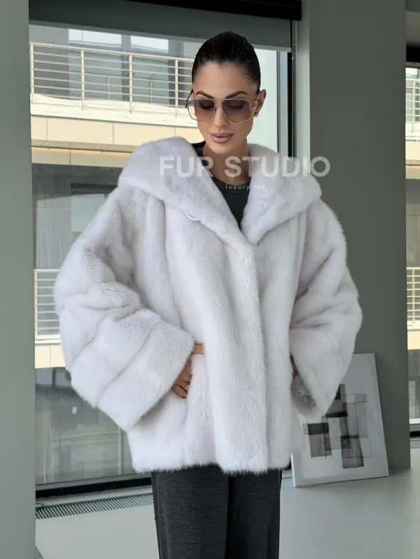 Белый норковый полушубок с капюшоном кобра 102879