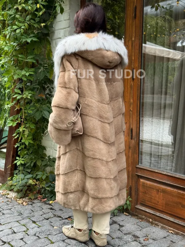 Бежевая норковая шуба с капюшоном рысь 102353