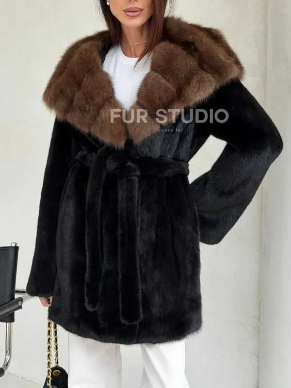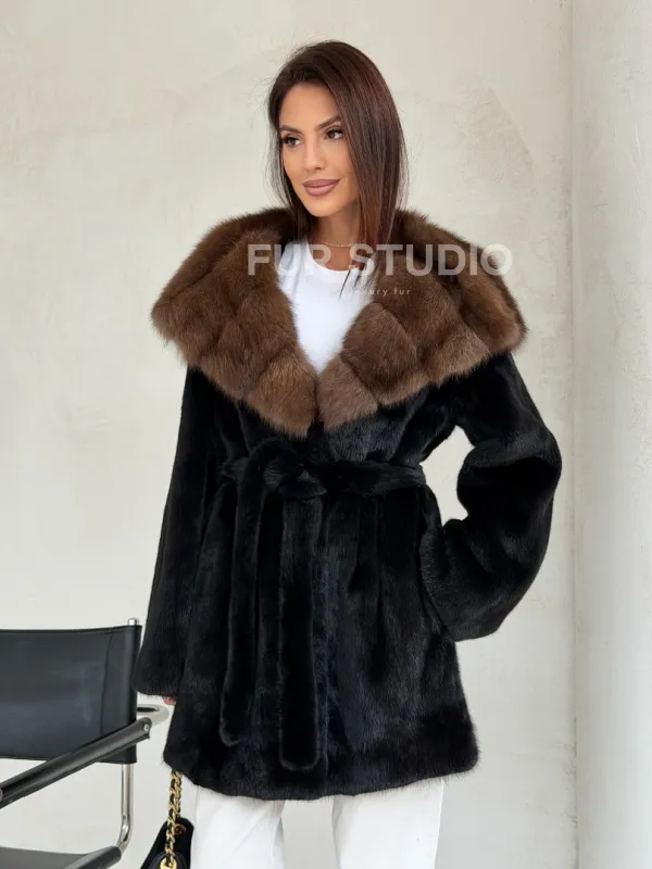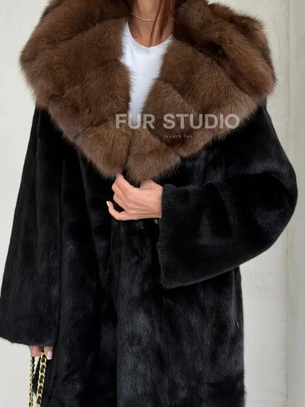 Мех данной шубы аукционная норка, цвет черный. Предлагается в размерах от 42 до 52. Длина модели 80-85 см, что выгодно подчеркивает фигуру девушек. Эта модель идеально подойдет для девушек и женщин, предпочитающих роскошные натуральные меха.