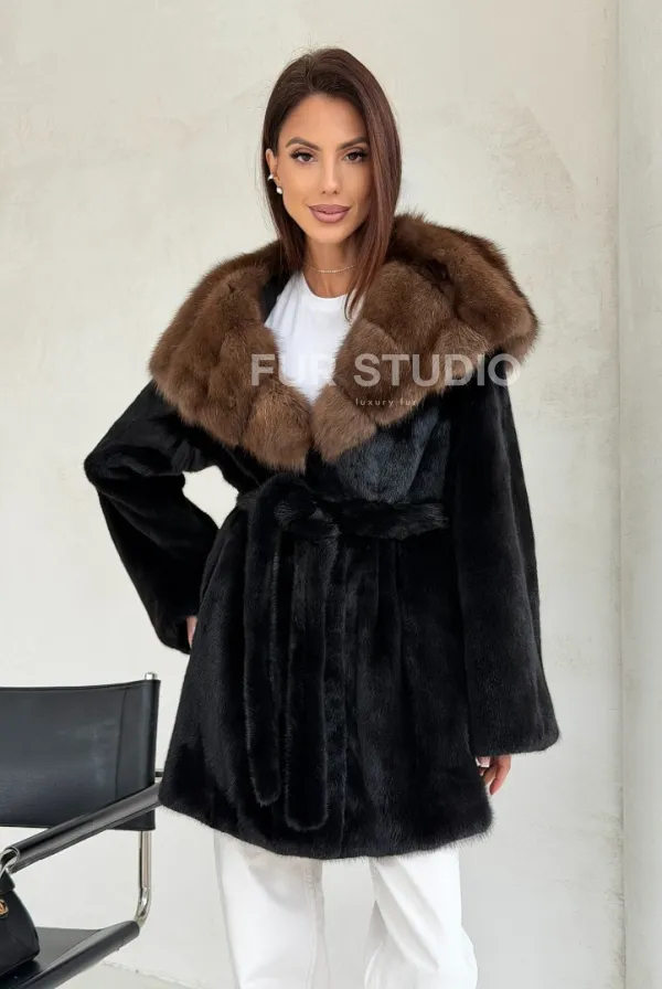 Черная шуба в роспуск с капюшоном соболь 102694