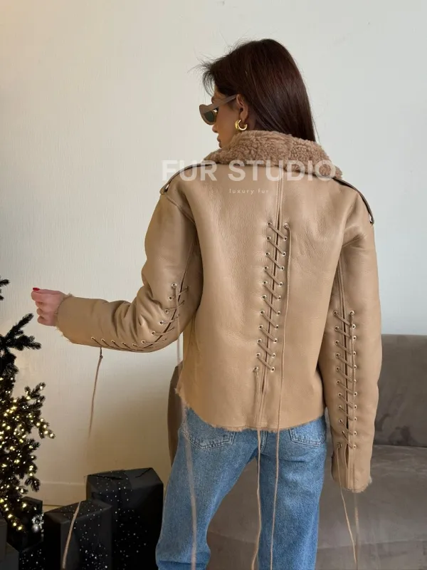 Дубленка - куртка со шнуровкой на спине. Модель предлагается в размерах от 40 до 48. Оптимальная длина моделей 50-55 см подчеркивает линии вашей фигуры. Эта дубленка станет неотъемлемой частью гардероба для тех, кто предпочитает роскошь и утонченность натуральной кожи.