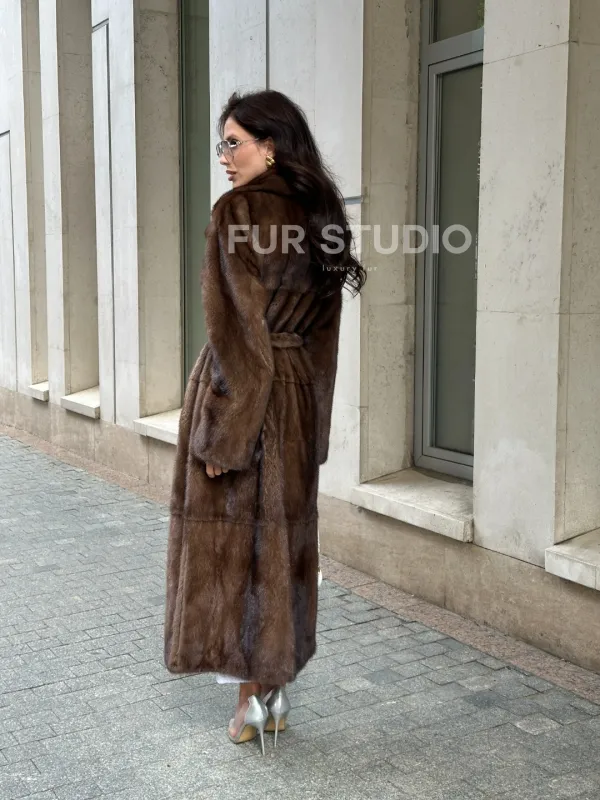 Мех данной шубы аукционная норка, цвет коричневый. Предлагается в размерах от 42 до 50. Длина модели 125-130 см, что выгодно подчеркивает фигуру девушек. Эта модель идеально подойдет для девушек и женщин, предпочитающих роскошные натуральные меха.