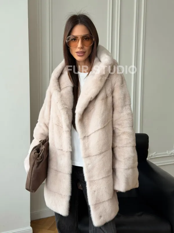 Мех данной шубы аукционная норка , цвет бежевый. Предлагается в размерах от 42 до 52. Длина модели 75-80 см, что выгодно подчеркивает фигуру девушек. Эта модель идеально подойдет для девушек и женщин, предпочитающих роскошные натуральные меха.