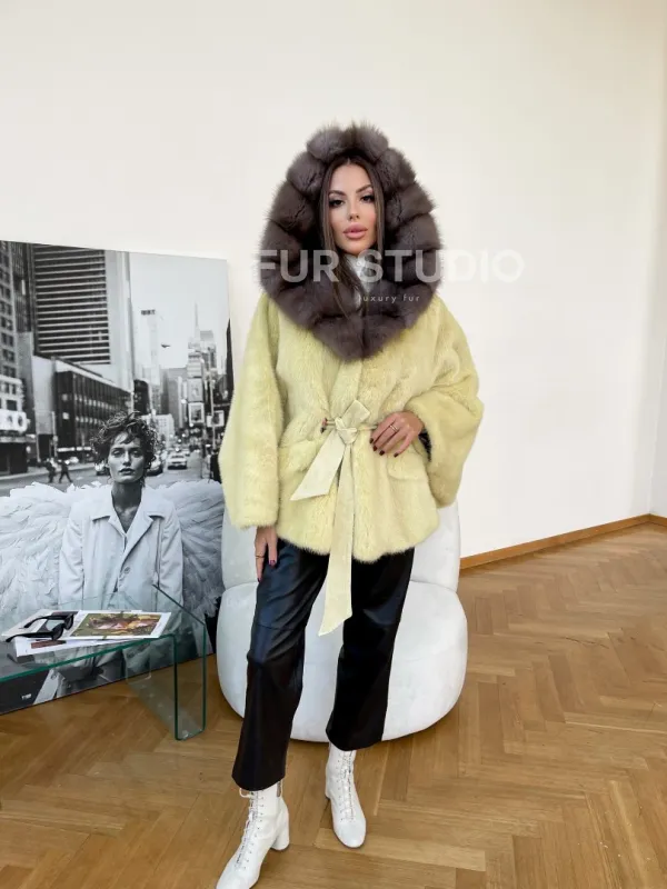 Оптимальная длина удобна при носке и не сковывает движение. Модель прекрасно подходит для девушек, которые водят машину. Оригинальный пояс зрительно уменьшит талию. Свободный крой позволит скрыть недостатки фигуры. Стильная сумочка сделает образ лаконичным. Купить норковое пончо с капюшоном из меха куницы могут женщины, которые любят выглядеть роскошно и со вкусом.