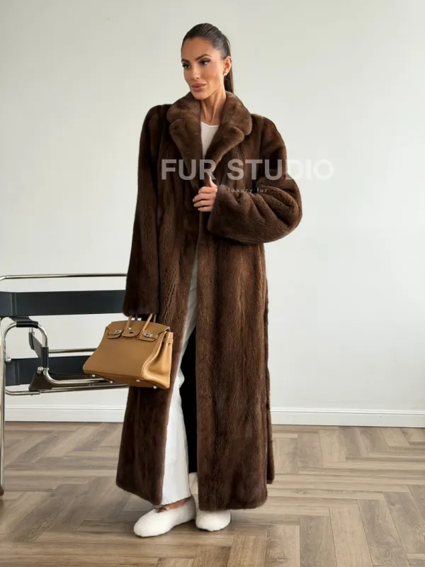 Мех данной шубы аукционная норка , цвет коричневый. Предлагается в размерах от 42 до 48. Длина модели 125-130 см, что выгодно подчеркивает фигуру девушек. Эта модель идеально подойдет для девушек и женщин, предпочитающих роскошные натуральные меха.
