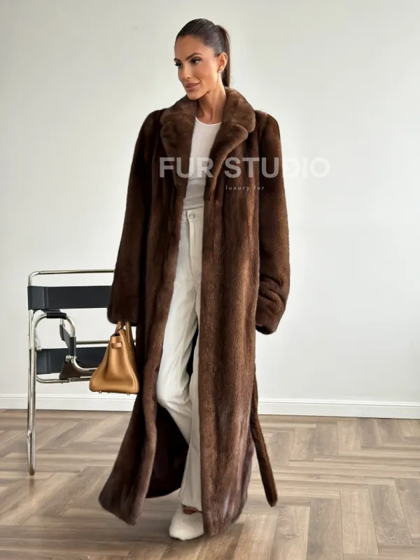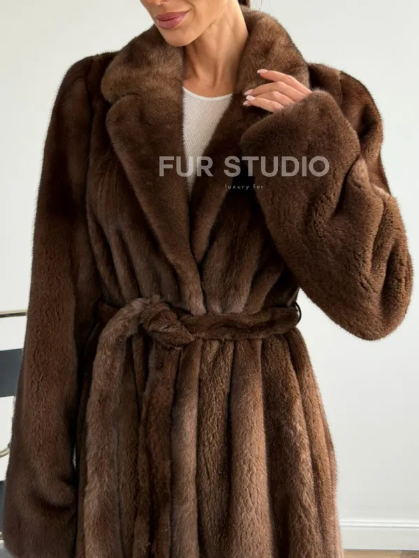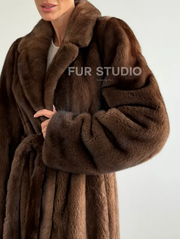 Прямая шуба из норки с поясом 102645