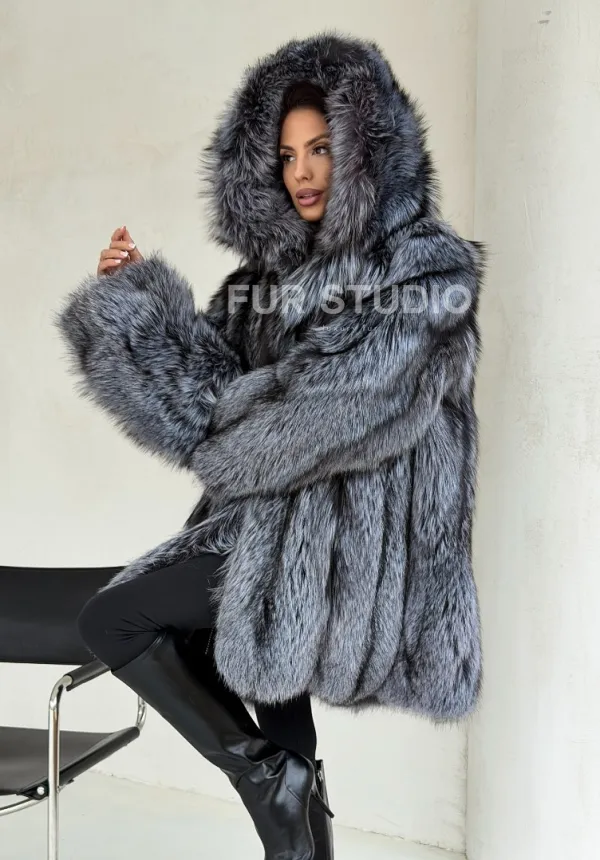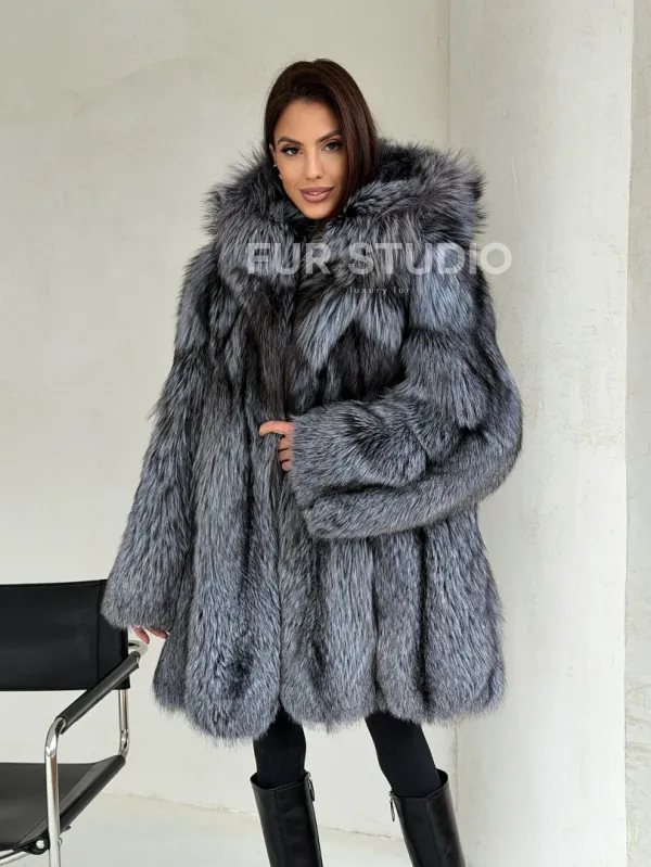 Шуба из натурального меха чернобурки с капюшоном 102686